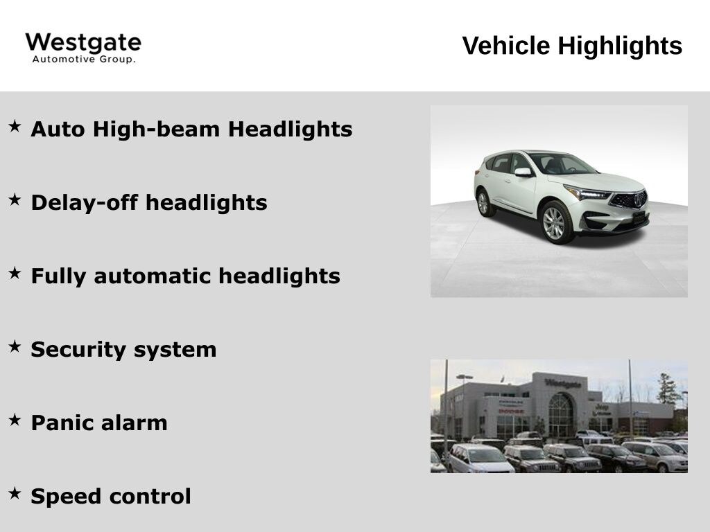 AWD, Auto High-beam Headlights, Delay-off headlights, Fully automatic headlights, Panic alarm, Security system, Speed control, 4-Wheel Disc Brakes, 4.17 Axle Ratio, 9 Speakers, ABS brakes, Air Conditioning, Alloy wheels, AM/FM radio: SiriusXM, Apple CarPlay/Android Auto, Auto-dimming Rear-View mirror, Automatic temperature control, Brake assist, Bumpers: body-color, Compass, Driver door bin, Driver vanity mirror, Dual front impact airbags, Dual front side impact airbags, Electronic Stability Control, Emergency communication system: AcuraLink, Exterior Parking Camera Rear, Four wheel independent suspension, Front anti-roll bar, Front Bucket Seats, Front Center Armrest, Front dual zone A/C, Front reading lights, Garage door transmitter: HomeLink, Heated door mirrors, Heated front seats, Heated Front Sport Seats, Illuminated entry, Knee airbag, Lane departure: Lane Keeping Assist System (LKAS) active, Leatherette-Trimmed Interior, Low tire pressure warning, Memory seat, Occupant sensing airbag, Outside temperature display, Overhead airbag, Overhead console, Passenger door bin, Passenger vanity mirror, Power door mirrors, Power driver seat, Power Liftgate, Power moonroof, Power passenger seat, Power steering, Power windows, Radio data system, Radio: Acura Premium Audio System, Rear anti-roll bar, Rear reading lights, Rear seat center armrest, Rear window defroster, Rear window wiper, Remote keyless entry, Speed-sensing steering, Split folding rear seat, Spoiler, Steering wheel mounted audio controls, Tachometer, Telescoping steering wheel, Tilt steering wheel, Traction control, Trip computer, Turn signal indicator mirrors, Variably intermittent wipers, Wheels: 19" x 8" Glitter Silver Multi-Spoke, AWD, Auto High-beam Headlights, Delay-off headlights, Fully automatic headlights, Panic alarm, Security system, Speed control.