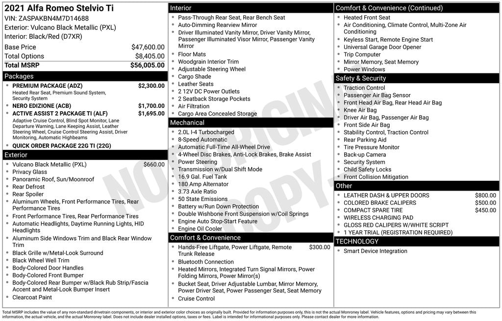 115V Auxiliary Power Outlet, 3.73 Axle Ratio, 4-Wheel Disc Brakes, 8 Speakers, ABS brakes, Active Assist 2 Package Ti, Active Blind Spot Assist, Adaptive Cruise Control w/Stop, Air Conditioning, Alloy wheels, AM/FM radio: SiriusXM, Apple CarPlay/Android Auto, Auto High Beam Headlamp Control, Auto-Dimming Exterior Mirrors, Auto-dimming Rear-View mirror, Automatic temperature control, Brake assist, Bumpers: body-color, Cargo Comp Adjustable Rail System, Cargo Net, Colored Brake Calipers, Compass, Dark Miron Badging, Dark Miron Exterior Mirror Caps, Dark Miron V Scudetto Grille, Delay-off headlights, Driver Attention Alert, Driver door bin, Driver vanity mirror, Dual front impact airbags, Dual front side impact airbags, Electronic Stability Control, Four wheel independent suspension, Front anti-roll bar, Front Bucket Seats, Front Center Armrest, Front dual zone A/C, Front reading lights, Fully automatic headlights, Garage door transmitter, Genuine wood console insert, Genuine wood dashboard insert, Genuine wood door panel insert, Gloss Black Roof Rails, Gloss Black Window Surround Moldings, Gloss Red Calipers w/White Script, Hands Free Power Liftgate, harman/kardon Premium Audio, Headlamp Washer, Heated door mirrors, Heated front seats, Heated Second Row Seats, Heated steering wheel, High intensity discharge headlights: Bi-Xenon, Highway Assist System, Illuminated entry, Infrared Windshield, Intelligent Speed Assist (ISA), Knee airbag, Lane Keep Assist, Leather Dash & Upper Doors, Leather Seats, Leather Shift Knob, Leather steering wheel, Low tire pressure warning, Memory seat, Miron Black Rear Valence Panel, Monochromatic Center Wheel Caps, Navigation System, Nero Edizione, Occupant sensing airbag, Outside temperature display, Overhead airbag, Overhead console, Panic alarm, ParkView Rear Back-Up Camera, Passenger door bin, Passenger vanity mirror, Perforated Leather Shift Knob, Power door mirrors, Power driver seat, Power Liftgate, Power moonroof, Power passenger seat, Power steering, Power windows, Premium Package, Quick Order Package 22G Ti, Radio data system, Radio: AM/FM/HD 8.8" w/Navigation, Rain sensing wipers, Rear anti-roll bar, Rear audio controls, Rear fog lights, Rear reading lights, Rear seat center armrest, Rear window defroster, Rear window wiper, Remote keyless entry, Security system, Speed control, Speed-sensing steering, Speed-Sensitive Wipers, Split folding rear seat, Spoiler, Sport Leather-Wrapped Steering Wheel, Steering wheel mounted audio controls, Tachometer, Telescoping steering wheel, Thatcham Security Equipment, Tilt steering wheel, Traction control, Traffic Jam Assist, Traffic Sign Recognition, Trip computer, Turn signal indicator mirrors, Variably intermittent wipers, Wheels: 19" x 8.0" Y-Spoke Aluminum, Wheels: 20" x 8.5" Miron Black Sport Aluminum, Wireless Charging Pad.