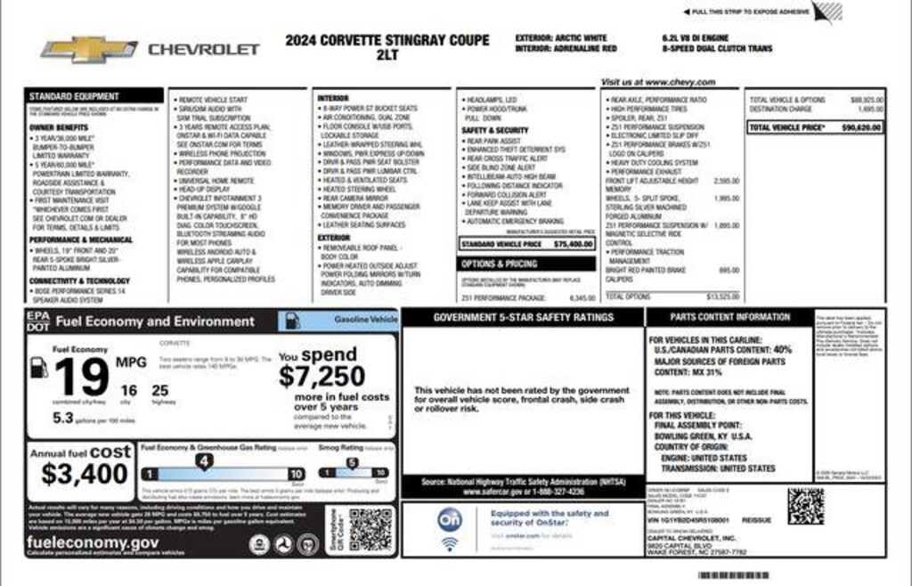 Westgate in Burgaw, NC offers reliable, carefully selected vehicles and a customer experience thatâs easy, transparent, and designed to give you confidence in every purchase.Arctic White 2024 Chevrolet Corvette Stingray 2LT Stingray 2LT2 Cargo Nets, Bose Performance Series Sound System w/14 Speakers, Driver Power Bolster Seat Adjuster, Electrical Theft Deterrent System, Electronic Limited-Slip Differential, HD Front & Rear Vision Cameras, Head-Up Display, Heated & Vented Driver & Passenger Seats, Heated Steering Wheel, Heavy-Duty Cooling System, Memory Driver & Passenger Convenience Package, Passenger Power Bolster Seat Adjuster, Performance Data & Video Recorder, Performance Exhaust w/Stainless-Steel Tips, Performance Rear Axle Ratio, Power Driver Lumbar Control Seat Adjuster, Power Passenger Lumbar Control Seat Adjuster, Power-Adjustable Outside Heated Mirrors, Preferred Equipment Group 2LT, Rear Cross Traffic Alert, Rear Z51 Spoiler, Side Blind Zone Alert, Universal Home Remote, Vehicle Inclination Theft Deterrent Sensor, Vehicle Interior Movement Theft Deterrent Sensor, Wireless Charging for Devices, Z51 Performance Brakes, Z51 Performance Package, Z51 Performance Suspension, 14 Speakers, 4-Wheel Disc Brakes, 8-Way Power Driver Seat Adjuster, 8-Way Power Passenger Seat Adjuster, ABS brakes, Air Conditioning, Alloy wheels, AM/FM radio: SiriusXM, Auto High-beam Headlights, Auto-dimming door mirrors, Auto-dimming Rear-View mirror, Automatic Leveling System Headlamp Control, Automatic temperature control, Body-Color Removable Roof Panel, Brake assist, Bright Red-Painted Calipers, Bumpers: body-color, Compass, Delay-off headlights, Driver door bin, Driver vanity mirror, Dual front impact airbags, Dual front side impact airbags, Electronic Stability Control, Emergency communication system: OnStar and Chevrolet connected services capable, Exterior Parking Camera Rear, Four wheel independent suspension, Front anti-roll bar, Front Bucket Seats, Front Center Armrest, Front dual zone A/C, Front Lift Adjustable Height w/Memory, Front reading lights, Fully automatic headlights, Garage door transmitter, GT1 Bucket Seats, Heads-Up Display, Heated door mirrors, Heated front seats, Heated steering wheel, Illuminated entry, Leather Shift Knob, Leather steering wheel, Low tire pressure warning, Memory seat, Mulan Lthr Seating Surfaces w/Perforated Inserts, Navigation System, Occupant sensing airbag, Outside temperature display, Overhead console, Panic alarm, Passenger door bin, Passenger vanity mirror, Performance Traction Management, Power door mirrors, Power driver seat, Power passenger seat, Power steering, Power windows, Premium audio system: Chevrolet Infotainment 3 Premium, Radio data system, Radio: Chevrolet Infotainment 3 Premium System, Rear anti-roll bar, Rear window defroster, Remote keyless entry, Security system, Speed control, Speed-sensing steering, Sport steering wheel, Steering wheel memory, Steering wheel mounted audio controls, Tachometer, Telescoping steering wheel, Tilt steering wheel, Traction control, Trip computer, Turn signal indicator mirrors, Variably intermittent wipers, Ventilated front seats, Voltmeter, Wheels: 19 x 8.5 Fr/20 x 11 Rr Bright Silver, Wheels: 19 x 8.5 Fr/20 x 11 Rr Sterling Silver, Z51 Perf Suspension w/Magnetic Selective Ride Cntrl, Come See this Chevrolet and Many More at Rolls-Royce Motor Cars Raleigh!!, A Full List of Optional Equipment can be seen by Clicking the Window Sticker Button Above!!, 2 Cargo Nets, Bose Performance Series Sound System w/14 Speakers, Driver Power Bolster Seat Adjuster, Electrical Theft Deterrent System, Electronic Limited-Slip Differential, HD Front & Rear Vision Cameras, Head-Up Display, Heated & Vented Driver & Passenger Seats, Heated Steering Wheel, Heavy-Duty Cooling System, Memory Driver & Passenger Convenience Package, Passenger Power Bolster Seat Adjuster, Performance Data & Video Recorder, Performance Exhaust w/Stainless-Steel Tips, Pe