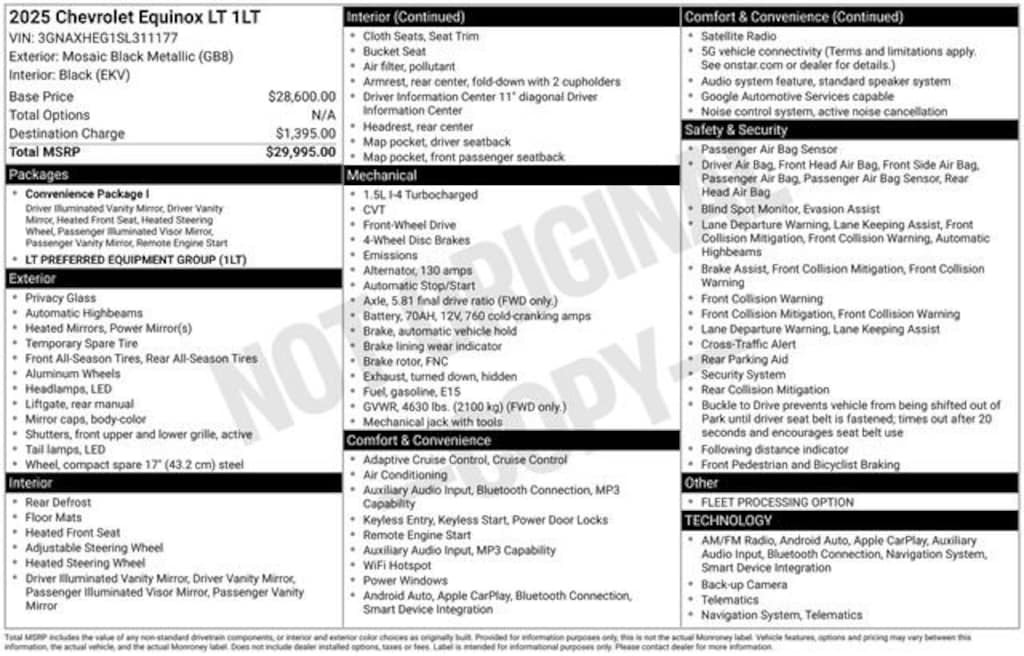 This stunning 2025 Chevrolet Equinox LT in Black is the perfect blend of style, technology, and capability. Equipped with a 1.5L DOHC engine and CVT transmission, this Equinox delivers an impressive 26 MPG in the city and 28 MPG on the highway, making it an exceptionally fuel-efficient choice. The sleek exterior design and 17 Grazen Metallic Machined-Face Aluminum wheels give this Equinox a commanding presence on the road.