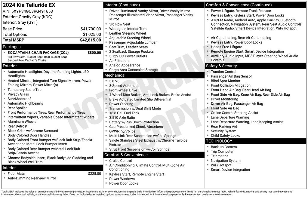 2nd Row Captain Chairs, 3.510 Axle Ratio, 3rd row seats: split-bench, 4-Wheel Disc Brakes, 6 Speakers, ABS brakes, Air Conditioning, Alloy wheels, AM/FM radio: SiriusXM, Apple CarPlay & Android Auto, Auto High-beam Headlights, Auto-dimming Rear-View mirror, Automatic temperature control, Brake assist, Bumpers: body-color, Carpet Floor Mats, Compass, Delay-off headlights, Driver door bin, Driver vanity mirror, Dual front impact airbags, Dual front side impact airbags, Electronic Stability Control, Emergency communication system: 911 Connect, EX Captain's Chair Package, Exterior Parking Camera Rear, Four wheel independent suspension, Front anti-roll bar, Front Bucket Seats, Front Center Armrest, Front dual zone A/C, Front reading lights, Fully automatic headlights, Heated & Ventilated Front Bucket Seats, Heated door mirrors, Heated front seats, Illuminated entry, Knee airbag, Leather Seat Trim, Leather Shift Knob, Leather steering wheel, Low tire pressure warning, Navigation System, Occupant sensing airbag, Outside temperature display, Overhead airbag, Overhead console, Panic alarm, Passenger door bin, Passenger vanity mirror, Power door mirrors, Power driver seat, Power Liftgate, Power moonroof, Power passenger seat, Power steering, Power windows, Radio data system, Radio: AM/FM Display Audio System, Rear air conditioning, Rear anti-roll bar, Rear audio controls, Rear reading lights, Rear seat center armrest, Rear side impact airbag, Rear window defroster, Rear window wiper, Reclining 3rd row seat, Remote keyless entry, Roof rack: rails only, Security system, Smart Key w/ Push Button and Remote Start, Speed control, Speed-sensing steering, Split folding rear seat, Spoiler, Steering wheel mounted audio controls, Tachometer, Telescoping steering wheel, Tilt steering wheel, Traction control, Trip computer, Turn signal indicator mirrors, Variably intermittent wipers, Ventilated front seats, Wheels: 20" x 7.5" Black Finish.