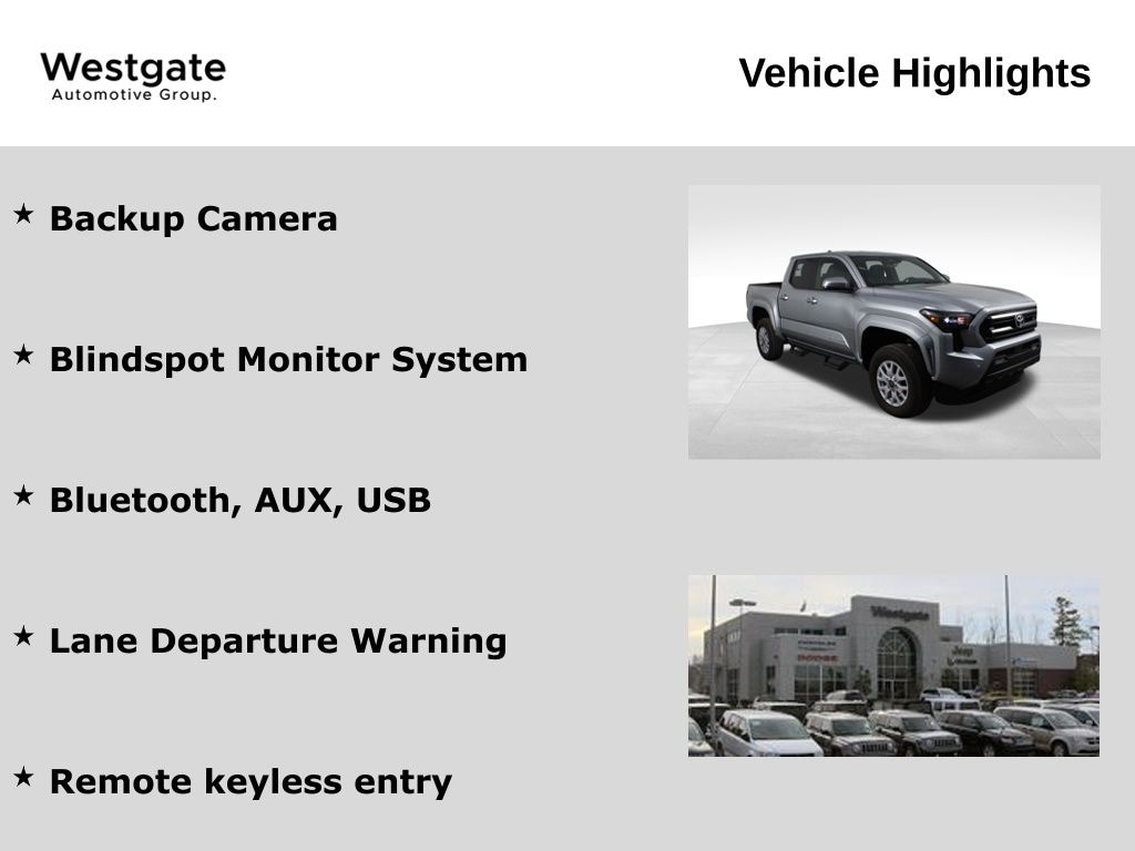 Silver 2024 Toyota Tacoma SR5 4WD with only 68 miles practically brand new! Backed by a clean CARFAX, this hard-to-find truck combines legendary Toyota reliability with rugged capability. Equipped with 8-Speed Automatic transmission and a fuel-efficient 2.4L 4-Cylinder engine, its ready for work or adventure.